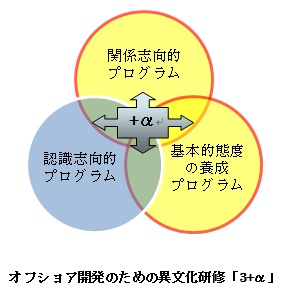特に、オフショア開発を支える異文化研修のためには以下のような3本の柱と、+αのモデルを学術的研究によって開発しており、今回の勉強会ではその中でも【関係志向的プログラム】と【基本的態度の養成プログラム】の基本的なトレーニングを実体験していただきます。